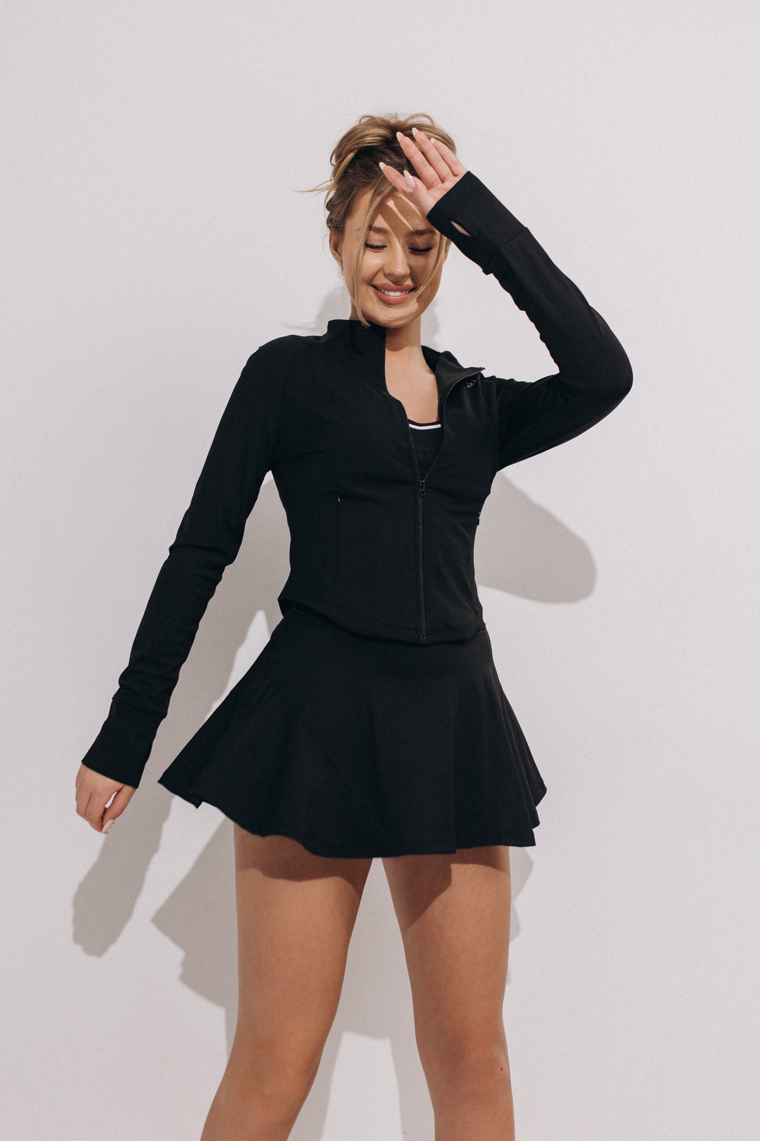 Wysoka stójka chroni szyję przed chłodem i wiatrem, a przy tym nadaje całości nowoczesny, miejski charakter. Długie rękawy z otworami na kciuki stabilizują materiał i zapobiegają jego przesuwaniu się podczas ruchu. To praktyczne rozwiązanie zwiększa komfort i pomaga utrzymać ciepło dłoni.